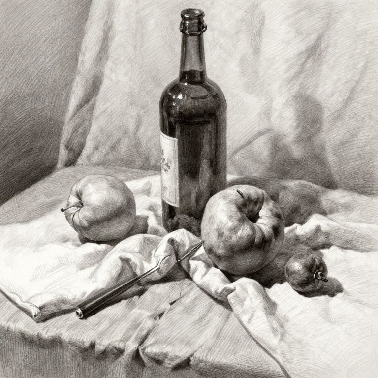 This black-and-white, highly detailed drawing depicts a still life scene. Centered is a dark bottle with a label, standing upright on a crumpled white cloth. Surrounding the bottle are three round, textured objects resembling onions or doughnuts, and a small, shiny apple. A long, thin tool, possibly a knife or skewer, rests diagonally on the cloth. The background features a softly textured, draped fabric, adding depth to the composition. The artist's use of cross-hatching and shading gives the drawing a realistic, three-dimensional quality. The overall style is reminiscent of classical still life art, emphasizing texture and form.