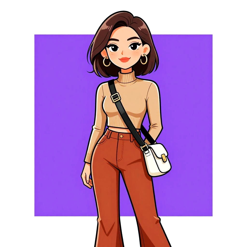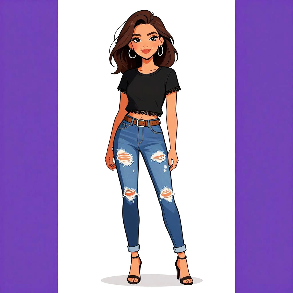Woman with pretty face and pretty hair. smiling Woman, casual chic, cropped black tank top with a scalloped hem, high-waisted paneled blue jeans with contrast stitching, cropped at the ankle, brown closed-toe mules, plain backdrop. --sref 1461