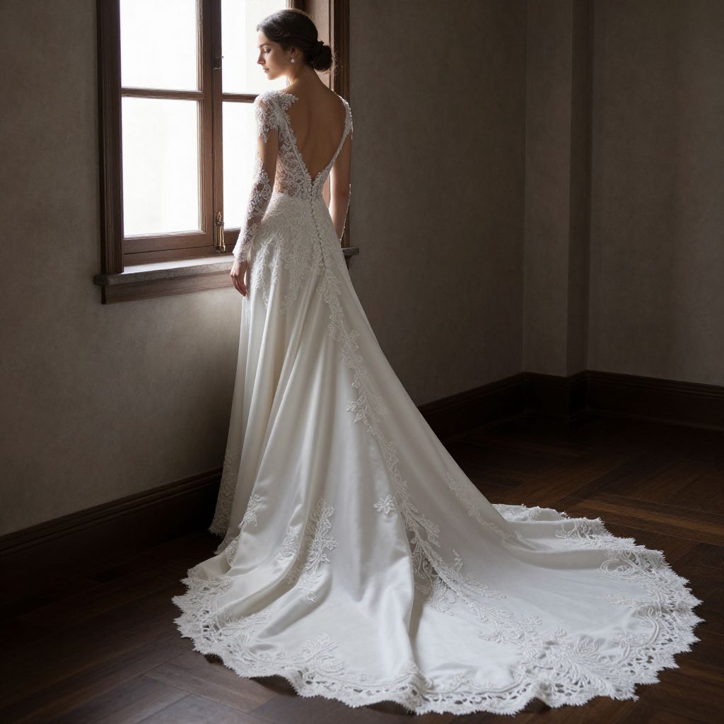 Photograph of a bride standing in a dimly lit room with dark wooden floors and a large window allowing soft, white light to filter through. She is facing away, showing the intricate lace back and sleeves of her white, satin wedding gown with a long, trailing train adorned with lace details. Her dark hair is styled in a neat updo. The walls are a muted gray, adding to the subdued, elegant atmosphere. The window is framed with dark wood, matching the floor. The bride's silhouette is softly illuminated, highlighting the delicate details of her dress.