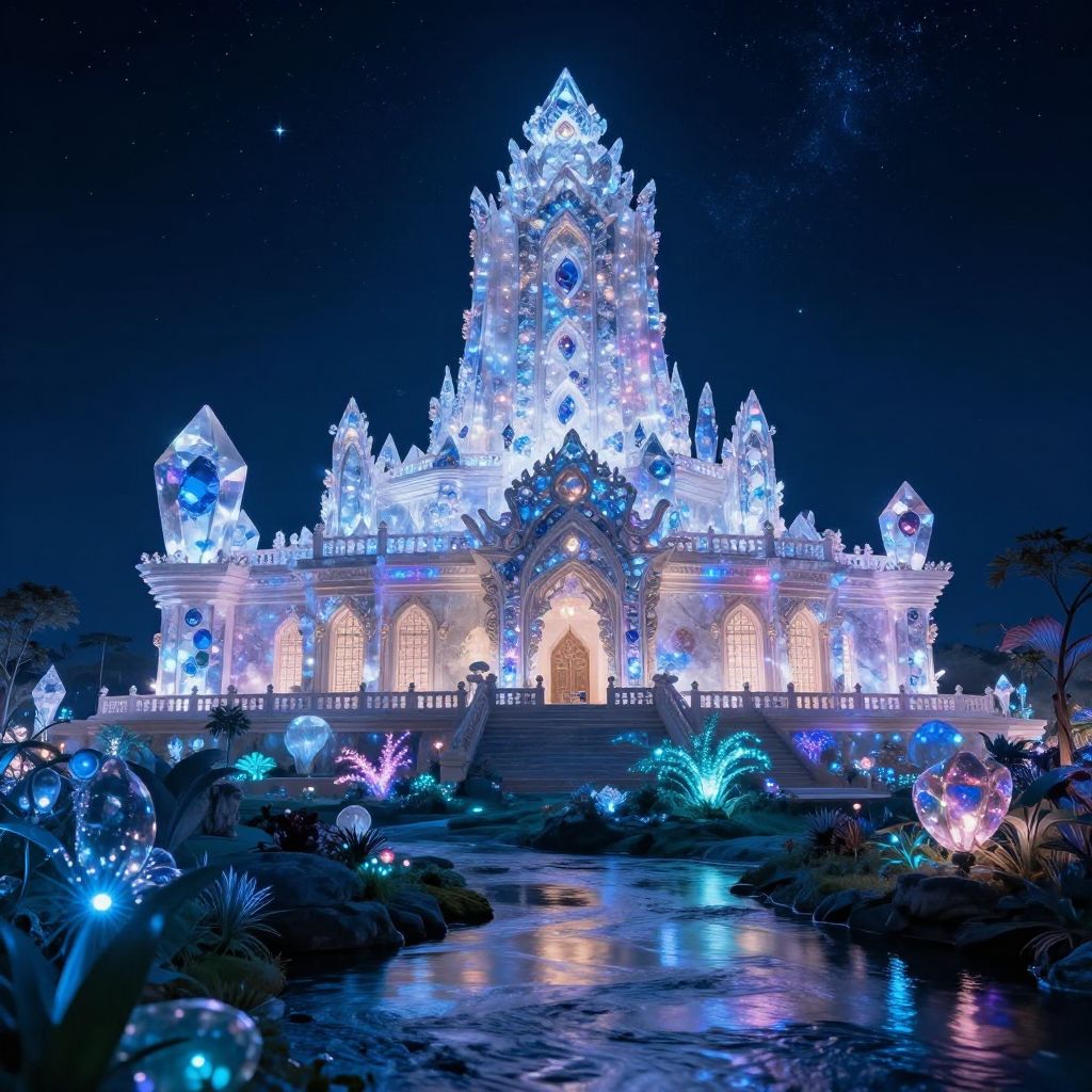 Fantasy temple art featuring a crystalline temple beneath a starry night sky, walls sparkling with embedded gemstones, bioluminescent flora illuminating the temple grounds, a gentle river reflecting the temple’s glow, otherworldly and serene atmosphere in a highly detailed fantasy style.