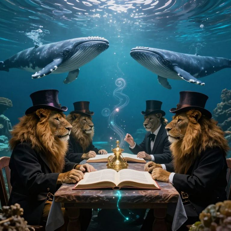 Photograph-like digital art depicting two anthropomorphic lions wearing black top hats and suits, seated at a wooden table underwater. Between them, an open book and a golden crown float, with a swirling smoke trail above. Two massive blue whales swim above, creating a majestic backdrop. The lions, with detailed, realistic fur and expressions, face each other intensely. Coral and ocean plants surround the table, adding to the underwater scene. The image combines surreal elements with realistic textures, creating a fantastical, symbolic setting. The lighting is blue, enhancing the underwater atmosphere.