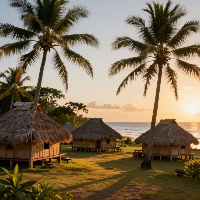 Oceania traditional island village at sunset, wooden huts with thatched roofs, palm trees swaying gently, warm golden light casting long shadows, serene ocean view in the background, lush tropical vegetation, painterly style