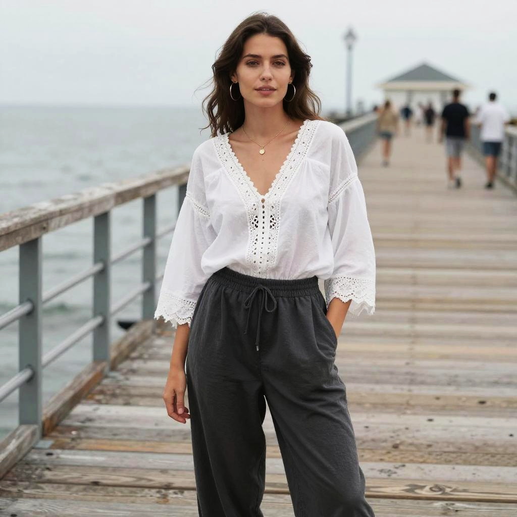 Photograph of a confident woman standing on a sandy beach. She has long, wavy brown hair and is wearing a white, button-up pajama top with black polka dots and matching pants. Her right hand is in her pocket. The background shows a shoreline with gentle waves and several people walking along the beach. The sky is clear with a hint of sunset colors.