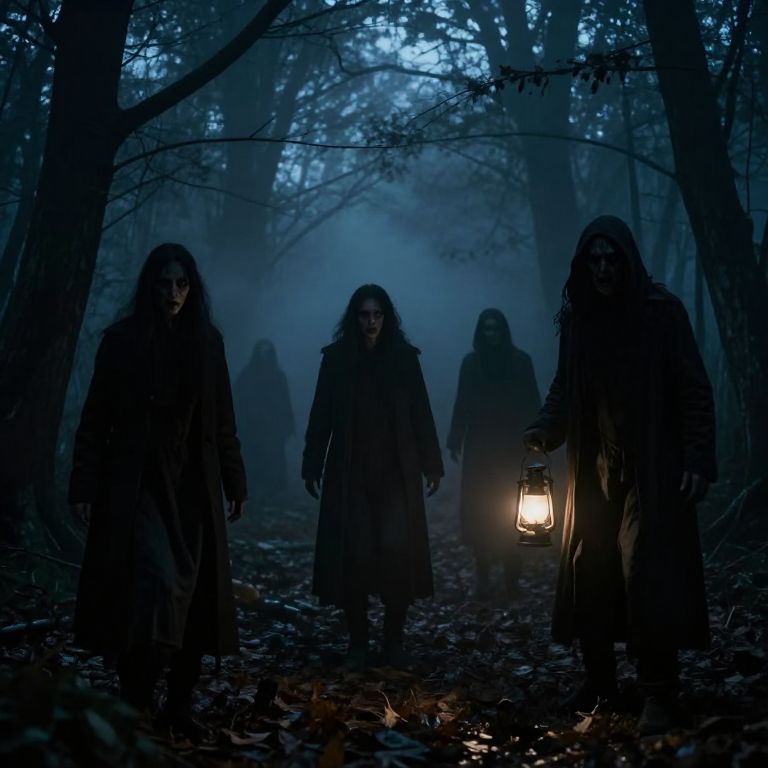 Murderous scene in a dark, foggy forest at midnight, shadowy figures lurking with ominous expressions, dim lantern light casting eerie glows, twisted trees and scattered leaves creating a tense, suspenseful atmosphere, cinematic horror style