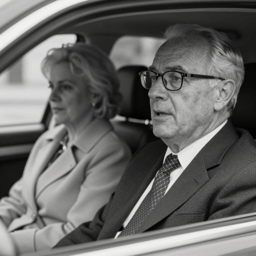 Black-and-white photograph of an elderly Caucasian man and woman sitting in a car. The man in the foreground is wearing glasses, a dark suit, white shirt, and patterned tie, with short light-colored hair and a focused expression. The woman in the background has light-colored hair and is wearing a light-colored coat, looking downward. The car interior is visible, with the window on the left side.