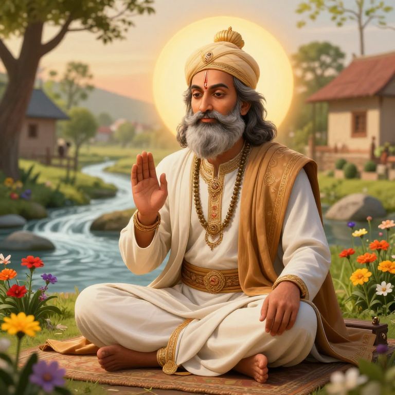Kabir, the 15th-century Indian mystic poet, depicted in traditional attire, seated in a serene village setting, surrounded by nature with flowing rivers and vibrant flowers, soft warm lighting, intricate details capturing his peaceful expression and spiritual aura.