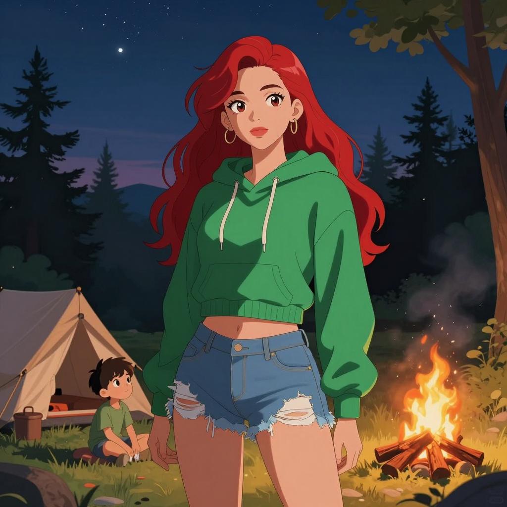 A detailed digital artwork features a confident young woman with long red hair wearing a green hoodie and ripped denim shorts, standing at a campsite during twilight. In the background, a young boy looks up at her with tents and a campfire illuminating the forest scene under a starry sky. The illustration showcases a vibrant, semi-realistic anime style with dynamic lighting and expressive character design.