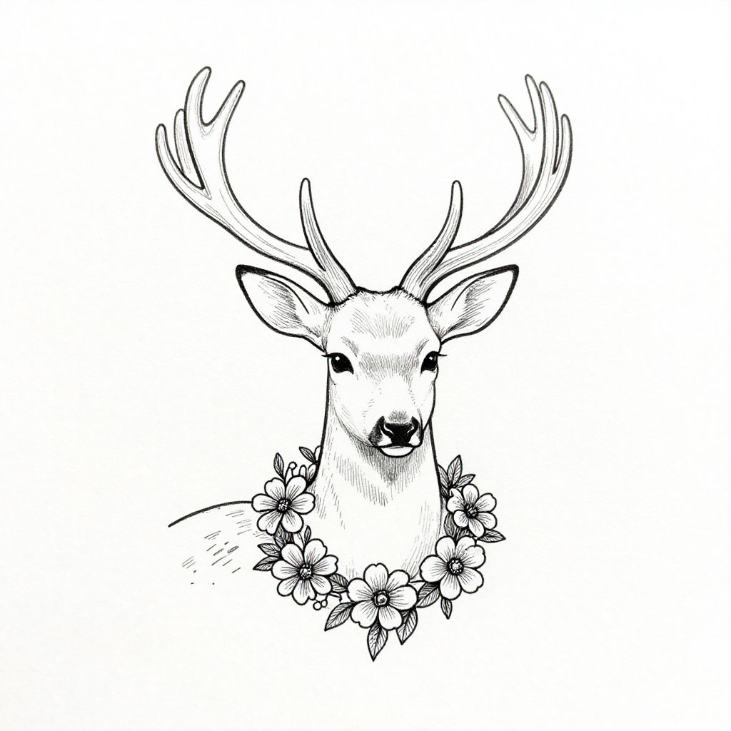 Deer with flowers drawing, minimalist black and white sketch of a gentle deer with floral wreath around its neck, clean lines and subtle shading, modern and elegant composition, emphasizing natural beauty and tranquility, pen and ink drawing style