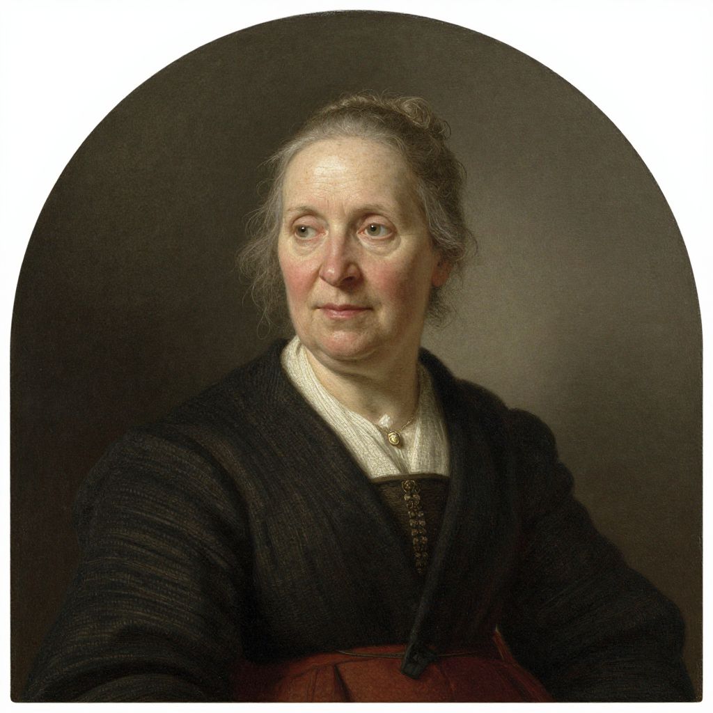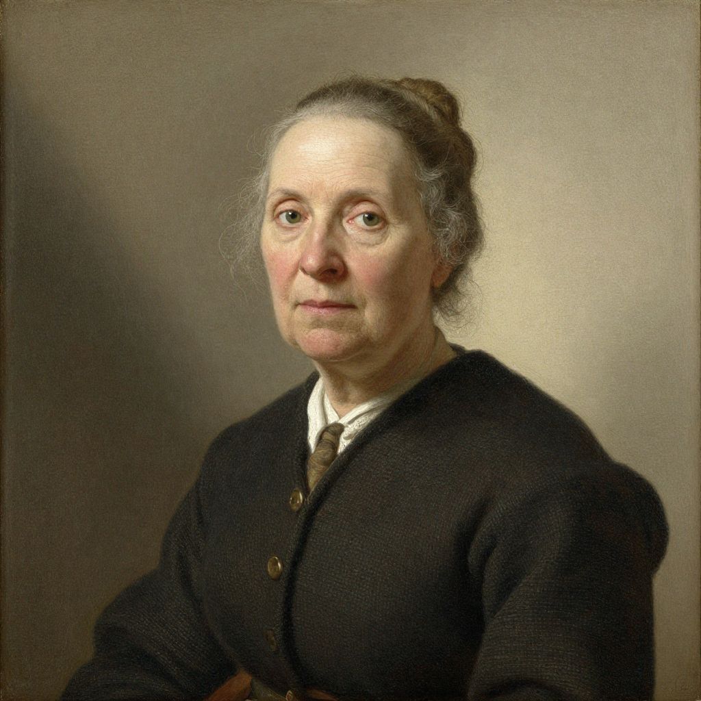 Photorealistic oil painting of an elderly woman with fair skin, gray hair in a bun, wearing a black buttoned cardigan over a white shirt