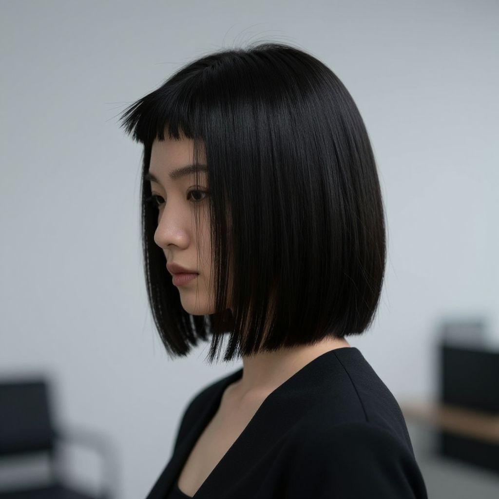 Photograph of six East Asian women standing outdoors against a white wall. They have straight, shoulder-length hair in various shades: two in light lavender, one in silver, two in brown, and one in dark brown. All wear black or white sleeveless or short-sleeved tops. Their expressions are neutral and serious, with slightly parted lips. The women's hair is styled simply, with some strands gently blowing in the wind. The background is minimal, focusing attention on the group. The image has a contemporary, minimalist style, emphasizing the contrast between their hair colors and clothing.