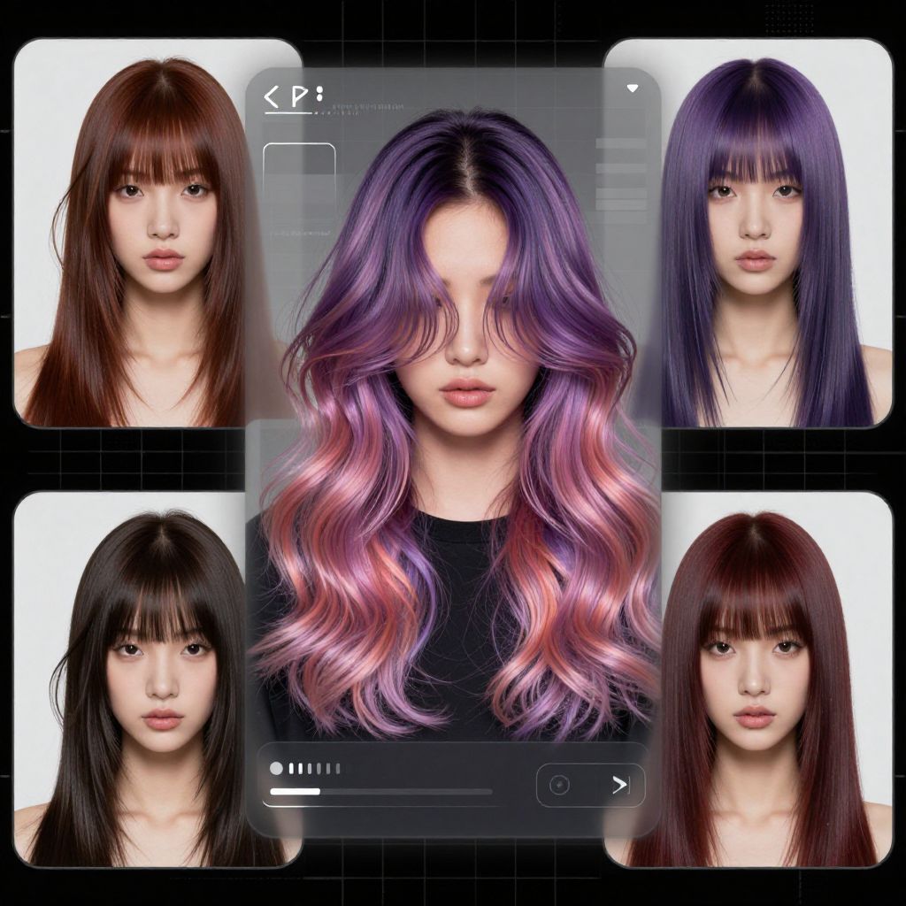 Test different hair colors on a modern fashion model standing against a minimalistic urban backdrop, displaying a range of trendy hair shades from pastel lavender to metallic silver, realistic textures, and impeccable styling with subtle wind effects for movement.