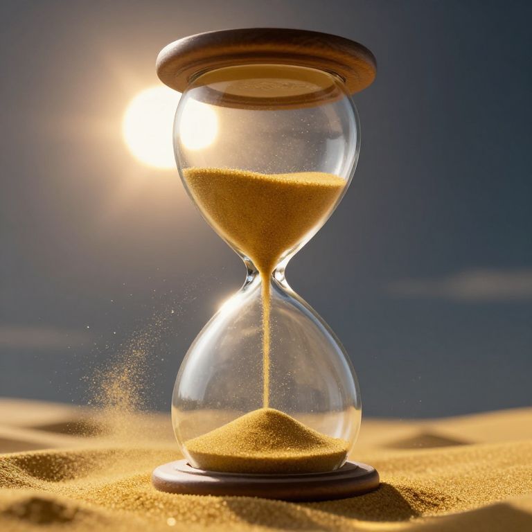 A colossal hourglass spills golden sand upward, burying the sun in a sky of suspended minutes and forgotten hours.