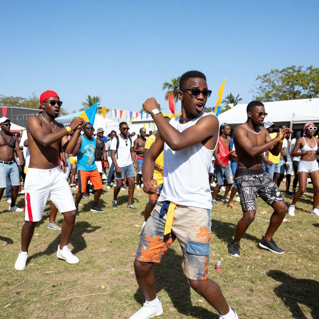 Big black men twerking in a lively outdoor festival setting, surrounded by cheering crowds, colorful flags and confetti, wearing casual summer outfits, expressive body language with dramatic dance poses, bright sunny day with blue skies and palm trees in background.