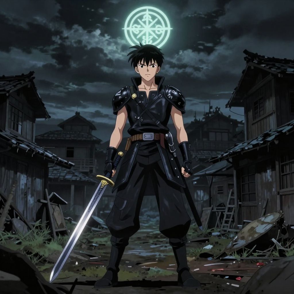 Anime-style illustration of a young, black-haired warrior with glowing eyes, holding a sword, standing in a dark, ruined village under a bright, magical