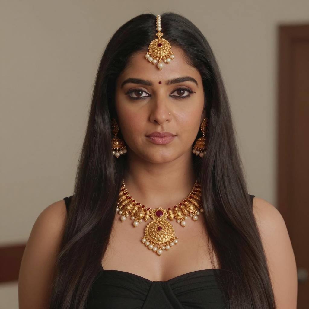 Indian party hairstyle long, photorealistic portrait of an Indian woman, long straight black hair, medium skin tone, wearing traditional gold jewelry including a headpiece, earrings, and necklace, black strapless top, brown eyes, subtle makeup, neutral expression, indoor background, soft lighting, centered, close-up, upper body, realistic ures