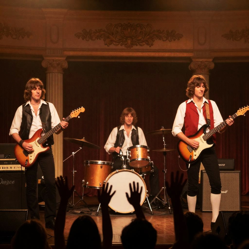 Photograph of a live rock band performance. Four male musicians with 70s-style hair on stage. Lead singer with red vest, white shirt, black pants, and white socks, guitar in hand. Bassist and drummer in center, guitarist on left. Audience hands reaching up in foreground. Dim, warm stage lighting. Vintage theater backdrop with columns and ornate details.