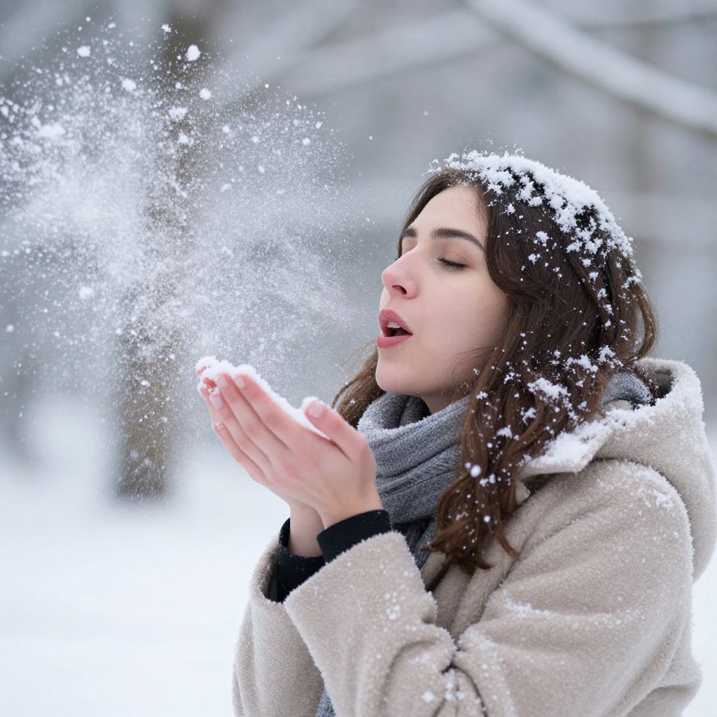 Capturing a moment of whimsical serenity, a woman breathes life into the falling snow, her hands cradling the ephemeral beauty of winter, evoking a sense of wonder and the transient magic of the season.