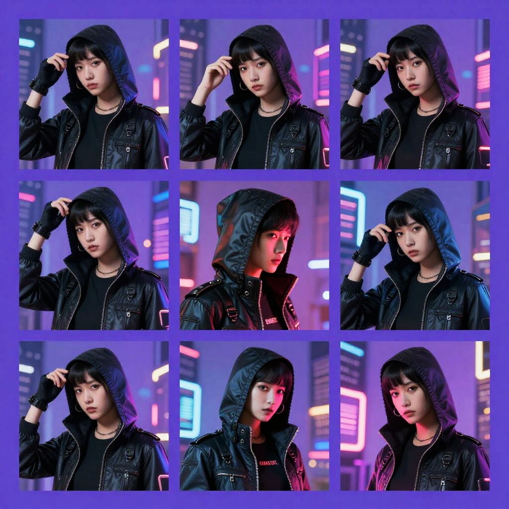 Character sheet poses for a futuristic cyberpunk rogue, illustrating multiple angles and gestures, sleek outfit with neon accents, detailed facial expressions, vibrant city background.
