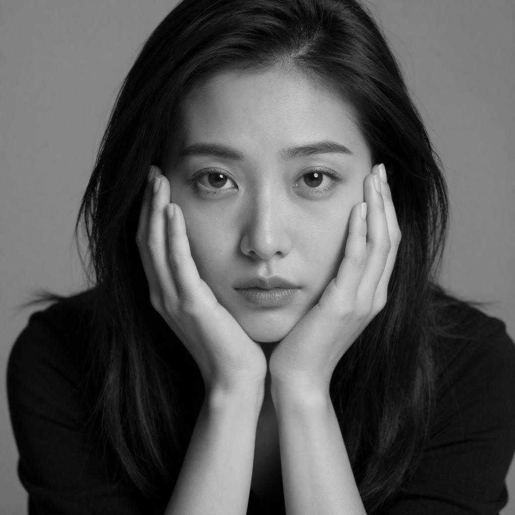 Photograph of an Asian woman with short black hair, intense gaze, and slightly parted lips. She holds a dark object near her face with her right hand. Monochromatic blue lighting, blurred dark leaves in the background. Close-up, upper body shot.