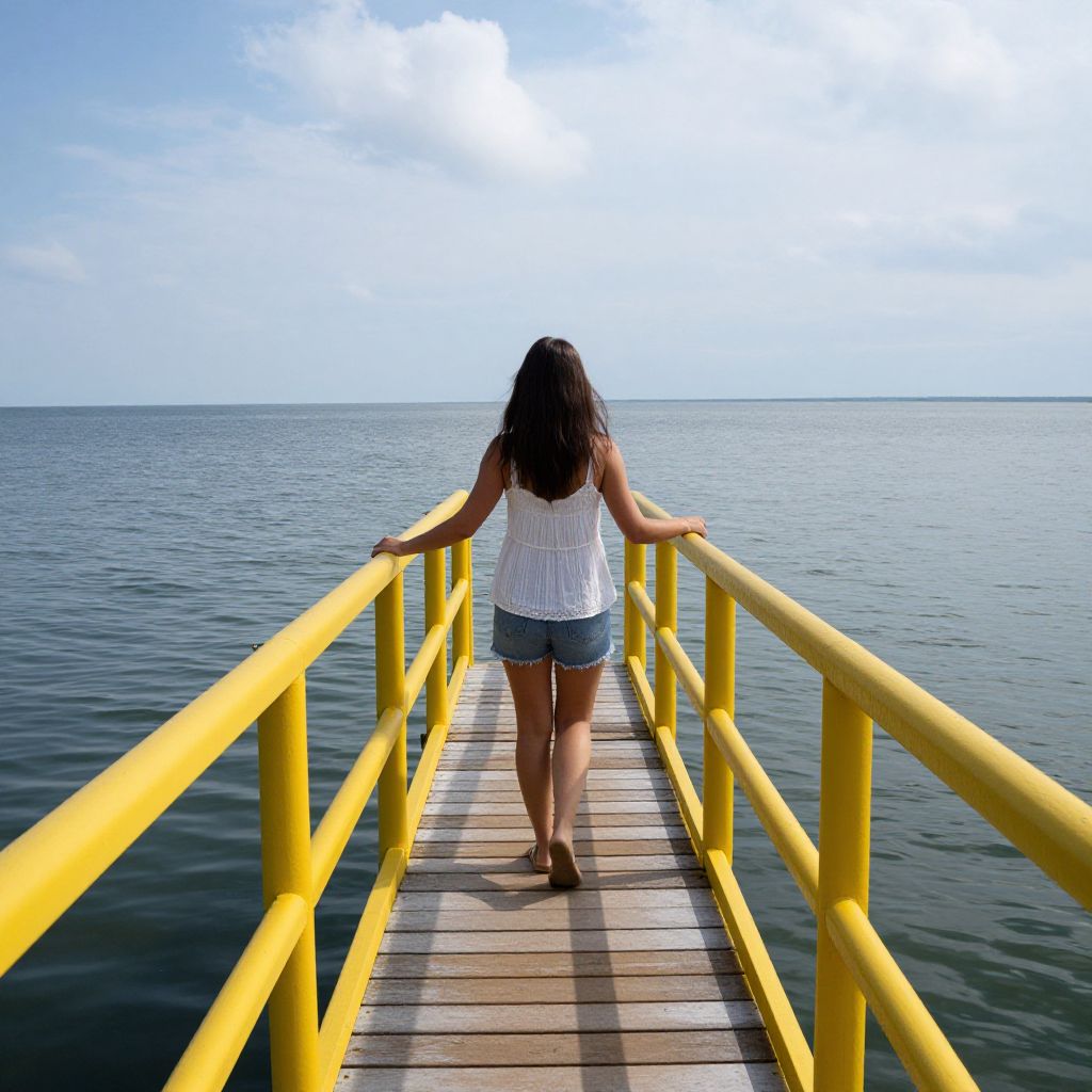 Photograph of a woman with long dark hair walking away on a wooden pier with bright yellow railings, extending into a calm, blue ocean under a partly cloudy sky. She wears a white sleeveless top and short denim shorts, with her arms resting on the railings. The pier's planks are light brown, and the yellow railings contrast vividly with the blue water and sky. The image has a serene, peaceful atmosphere, emphasizing the simplicity and beauty of the natural and man-made elements.