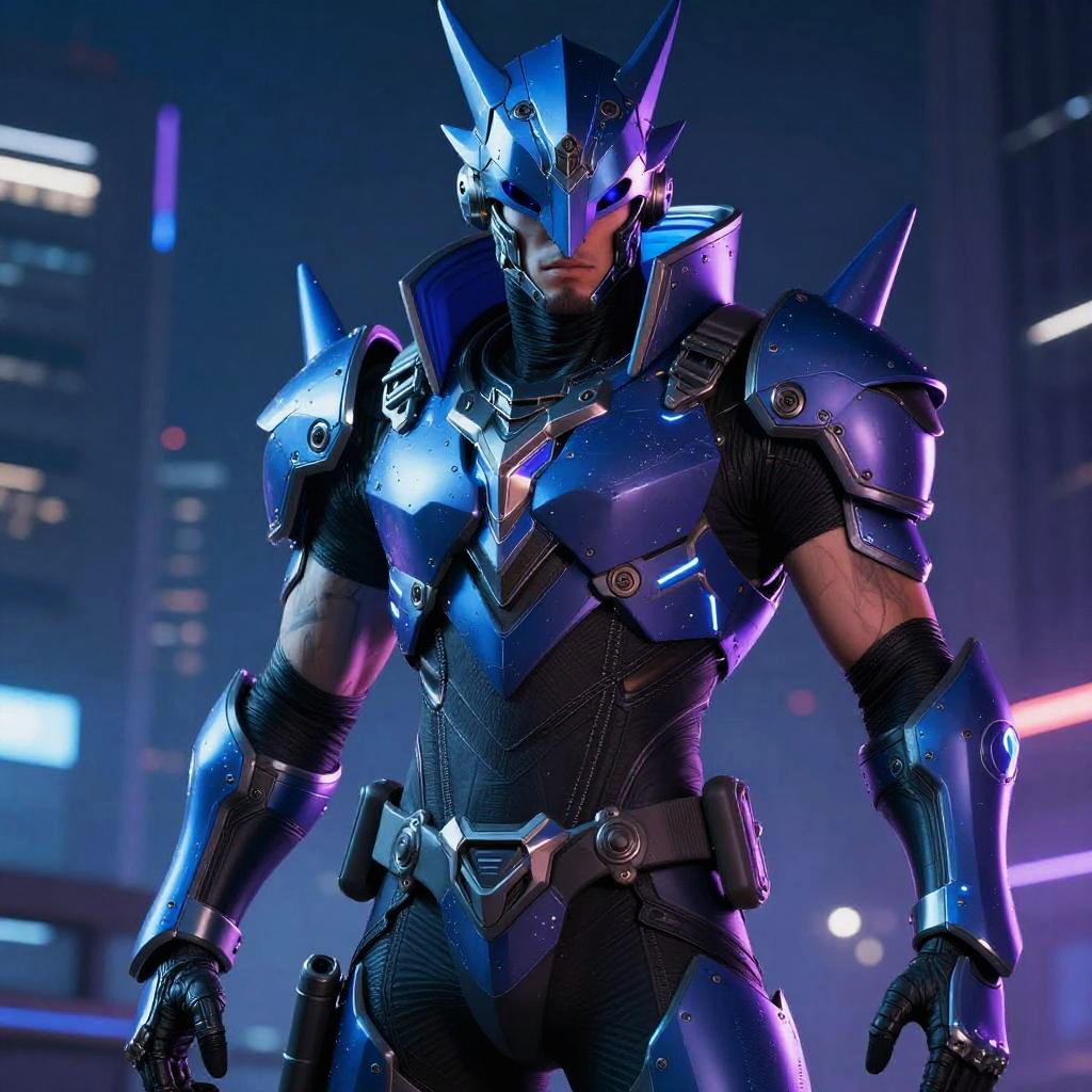 Half man half jackal, cyberpunk futuristic warrior with neon blue and purple accents, urban night city background, sleek armor with animalistic features, intense expression, digital art