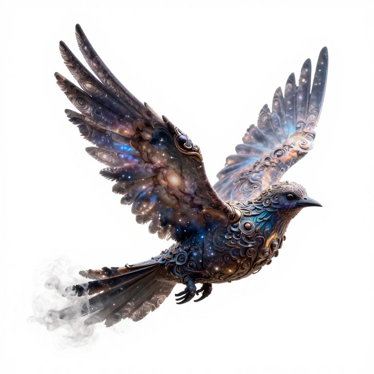 Wedding galaxies, spirals, space, nebulae, stars, smoke, iridescent, intricate detail, in the shape of a bird, octane render, 8k, white background, png,