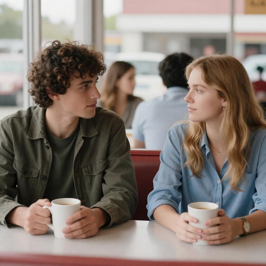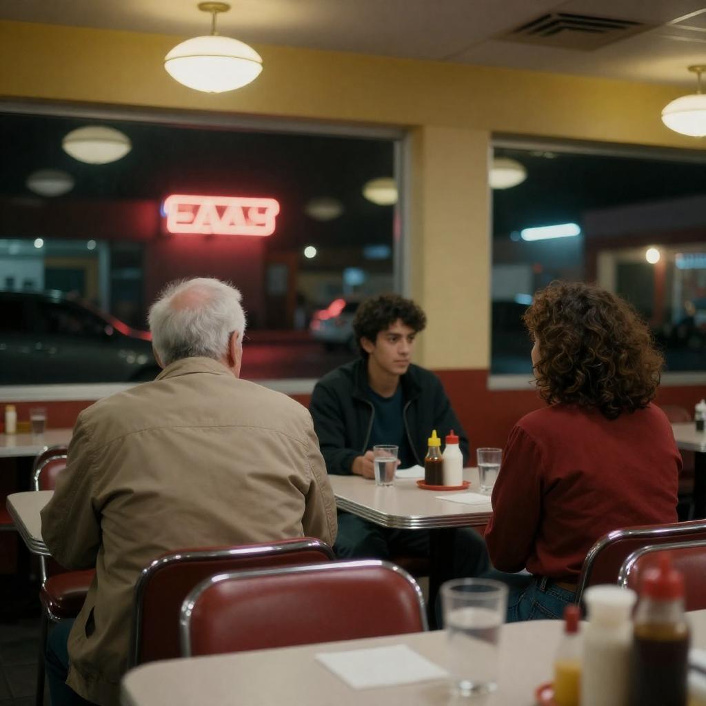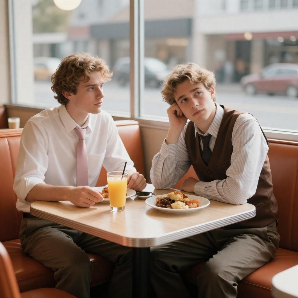Photograph of two men in a diner. One man in pastel pink and blue shirt, blue pants, glasses, and curly hair, holds the arm of a man in a gray suit, brown tie, and dark hair, sitting at a booth with a plate of pancakes and a cup. Green pendant lights hang above. Diner has large windows and tiled floor. Second man looks up at the first man with a slightly concerned expression. Background shows more booths and tables.