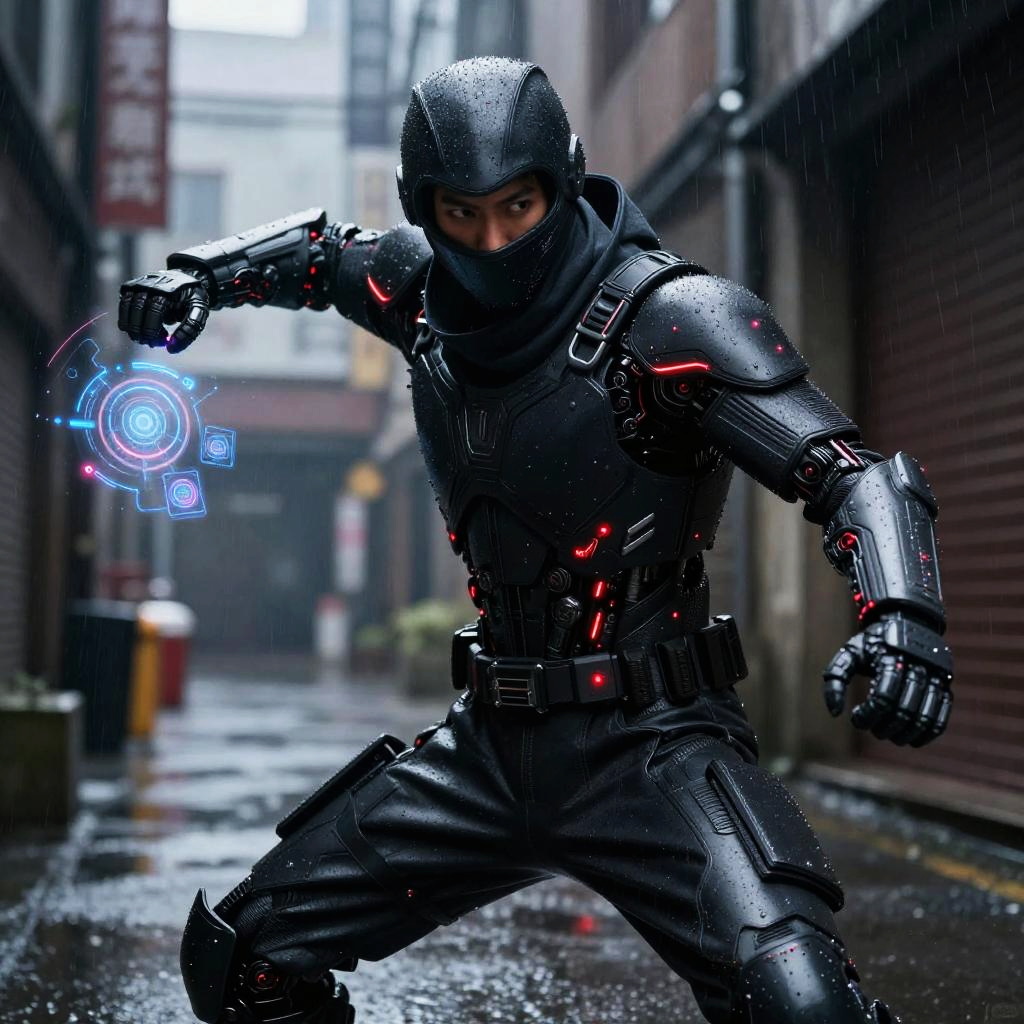 Cyberpunk mercenary art depicting a futuristic urban warrior clad in neon-lit armor, wielding high-tech weaponry amid rain-soaked city streets glowing with holographic advertisements, intricate details and vibrant colors in a dystopian metropolis.