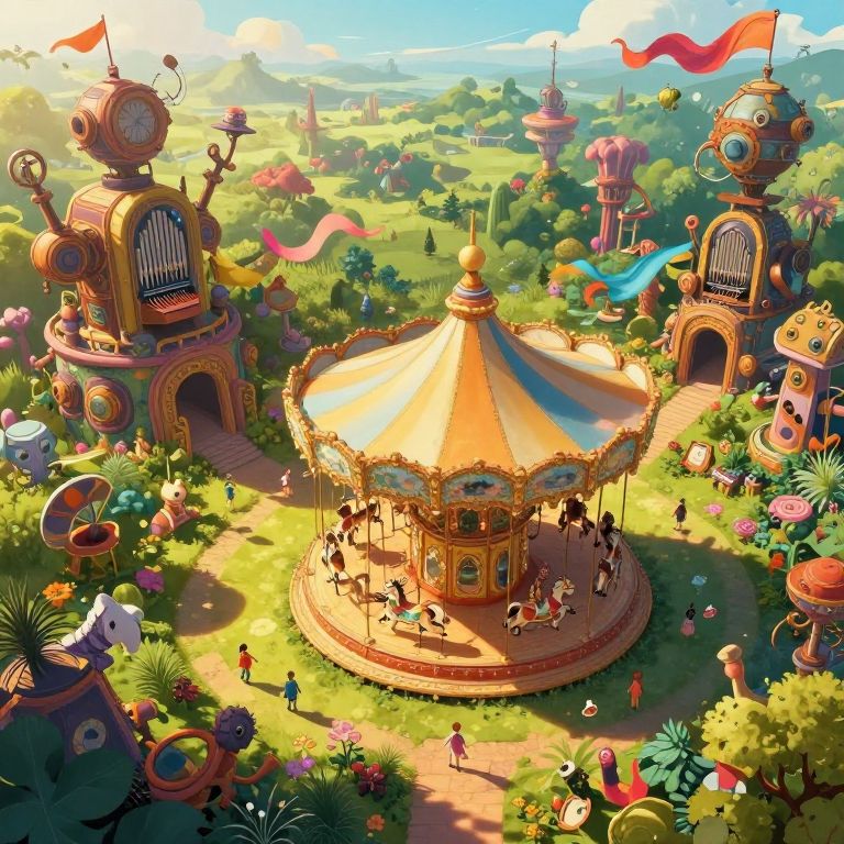 An imaginative steampunk-inspired illustration captures a whimsical carousel in a dreamlike style, viewed from an aerial perspective above the vibrant scene. The carousel stands amidst a lush, overgrown garden with towering mechanical structures and fantastical creatures integrated into its design. Colorful fabrics flutter in the wind alongside the rhythmic sound of the organ music, evoking a sense of joy and wonder intermingled with nostalgia for forgotten moments of innocence. As the camera zooms out to reveal the expansive, surreal landscape, warm sunlight filters through the lush foliage, casting elongated shadows that dance across the scene like living silhouettes, uniting both beauty and mystery in this whimsical world where reality and fantasy collide.