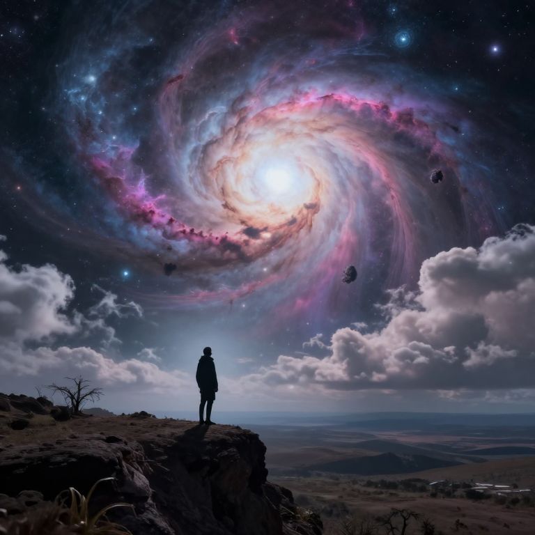 A lone figure stands at the edge of a vast, surreal landscape, gazing into a cosmic void with swirling clouds and vibrant nebulae.