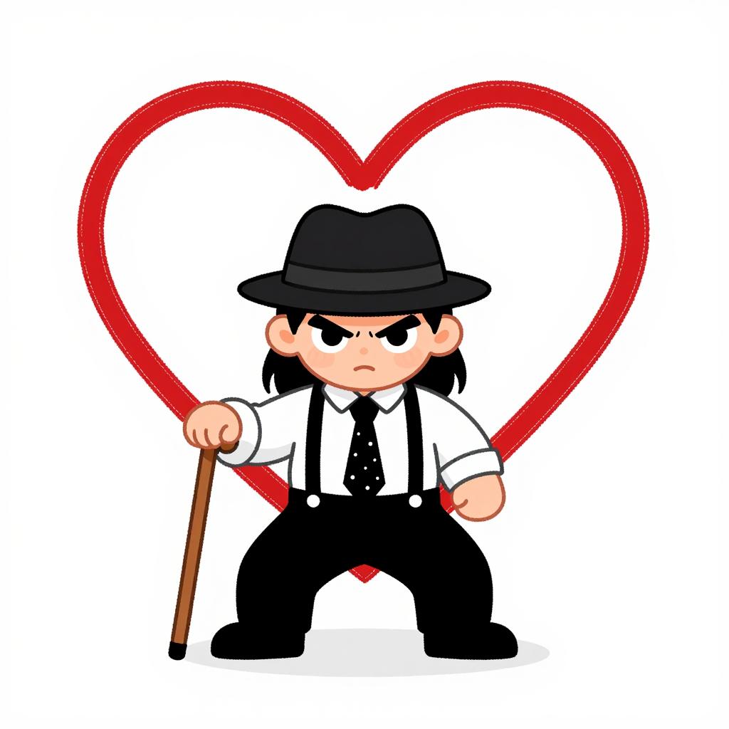 Illustration of a young boy with long black hair wearing a black hat, white shirt, black tie with white dots, black suspenders, and black pants. The boy crouches with an intense expression, holding a wooden cane in one hand. Behind him, a large red heart shape is painted with rough strokes, set against a plain white background, creating a symmetrical composition.