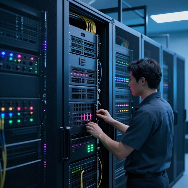 Photograph of an Asian man with short black hair, wearing a dark blue short-sleeve shirt, standing in a blue-lit server room. He is facing a row of black server racks filled with various network equipment, including colorful LED indicators (red, green, blue, yellow) and cables. The man is adjusting the settings on one of the servers with his right hand. The server racks are tall and filled with multiple shelves of equipment. The background features fluorescent lighting and additional server racks extending into the distance, creating a technical, industrial atmosphere.