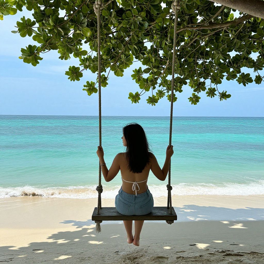 Woman seated on a wooden swing suspended by thick rope, gazing out at the turquoise ocean under a canopy of lush green leaves, with gentle waves lapping the sandy shore below.