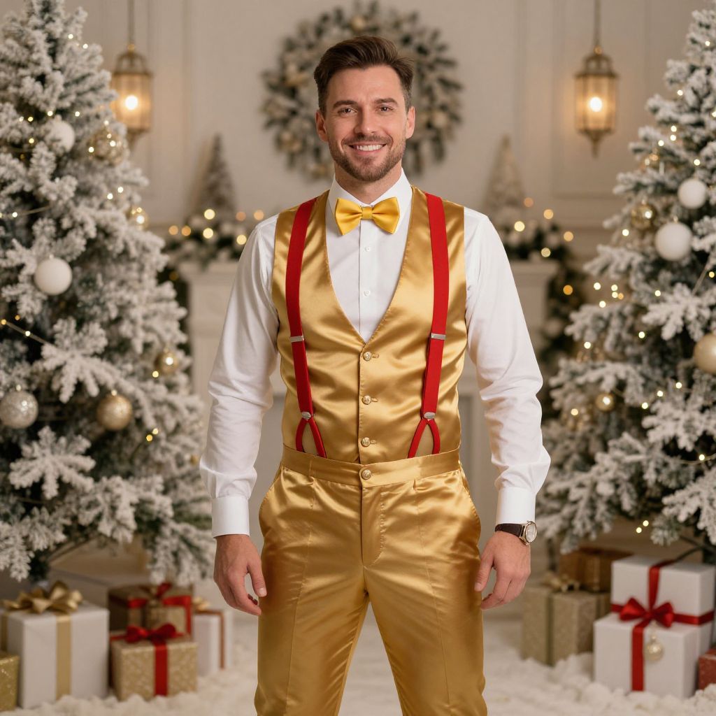 A smiling man dressed in festive gold satin pants, matching vest, and a yellow bow tie poses with red suspenders amidst a beautifully decorated Christmas setting featuring snow-covered trees and wrapped gifts. The warm bokeh lights and holiday décor create a cozy and elegant Christmas atmosphere.