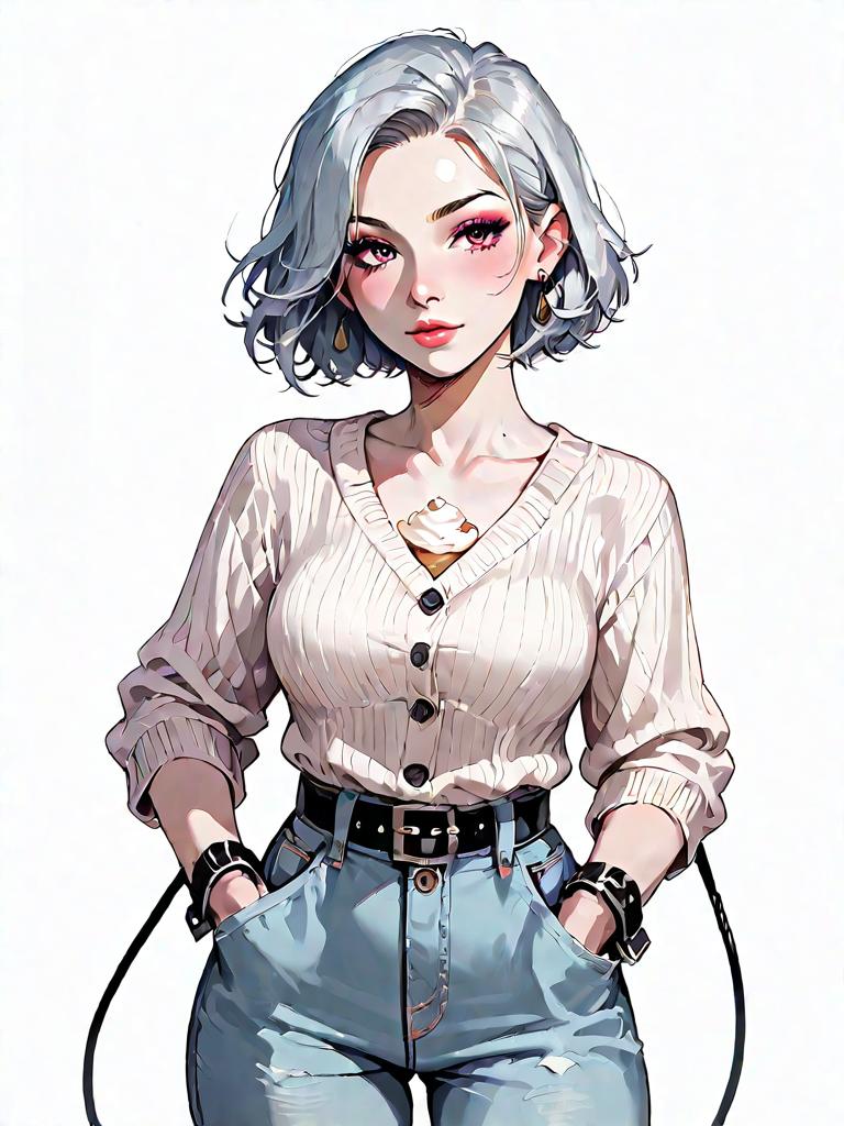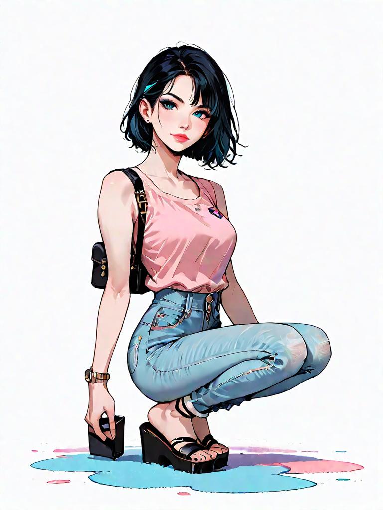 1girl, source_comics, realistic face, full body shot, Woman, casual chic, sleeveless pink top with a peplum ruffle at the waist, light wash blue denim jeans, cuffed at the ankle, black open-toe platform sandals, small taupe shoulder bag, minimalist rose gold watch, plain white background