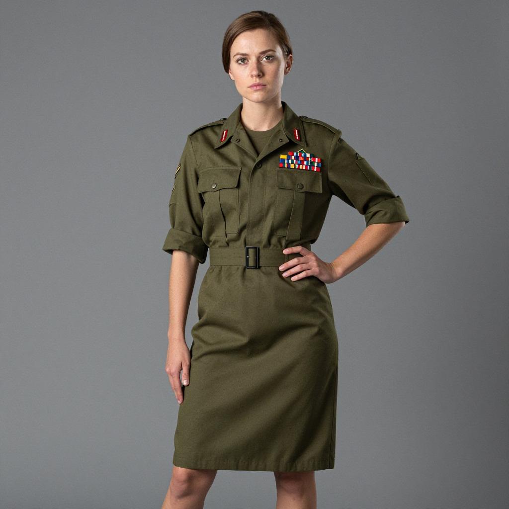 Portrait of a young Caucasian woman with brown hair wearing an olive green military dress uniform. The uniform features multiple colorful ribbons on the chest and military insignia on the sleeves. The sleeves are rolled up slightly, with the left hand resting on the hip and the right arm relaxed at the side. The background is gray with studio lighting highlighting realistic details and subtle shadows on the uniform fabric.