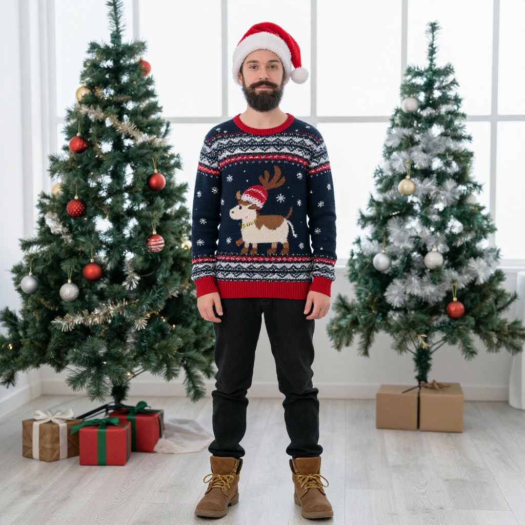 Photograph of a bearded man standing in front of two decorated Christmas trees. He wears a red and white Santa hat, a dark blue Christmas sweater with a reindeer design and white snowflake patterns, black pants, and brown lace-up boots. The trees are adorned with red and silver ornaments, and silver tinsel. Presents wrapped in red and brown paper with ribbons are placed at the base of the trees on a light wooden floor. Bright natural light from a window in the background illuminates the scene.