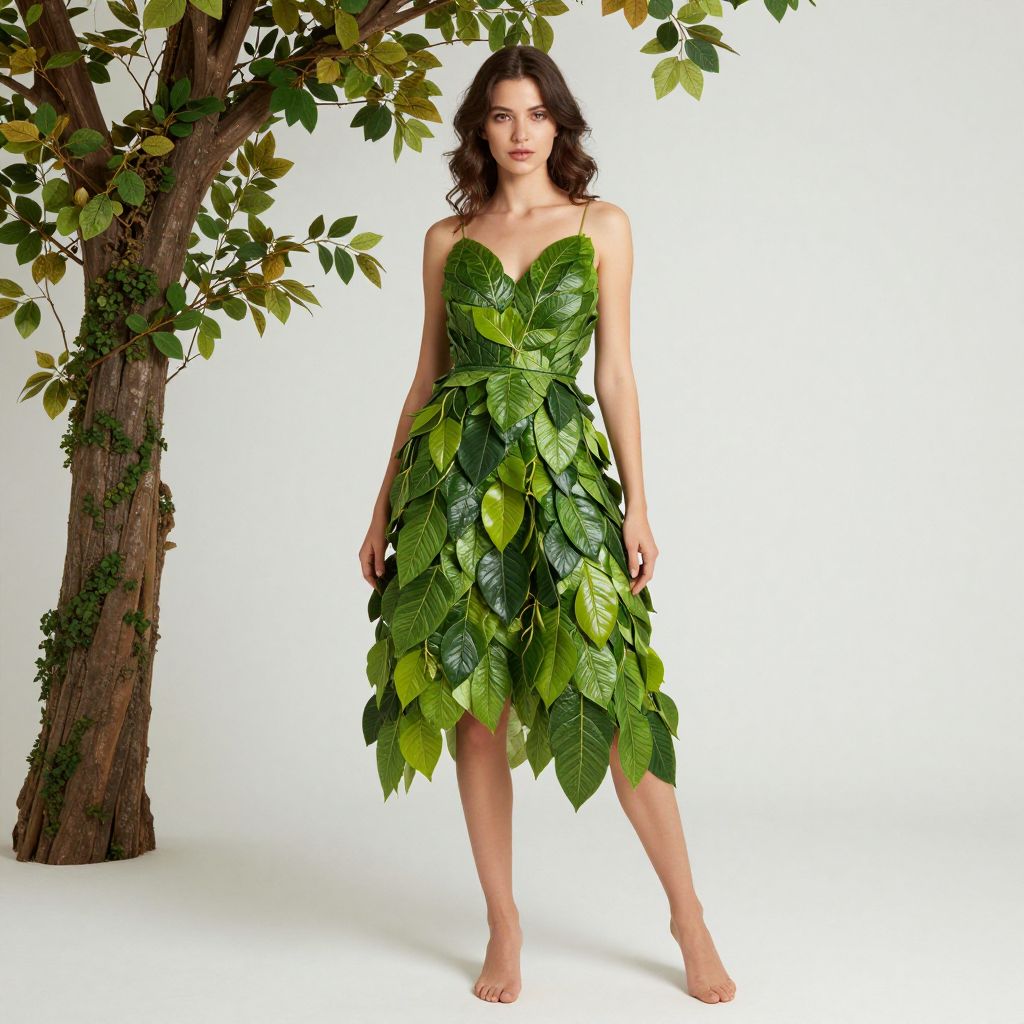 Photograph of a woman with wavy dark hair, wearing a strapless dress made of green leaves, standing barefoot next to a leafy tree