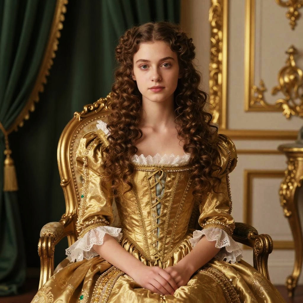 Photograph of a young woman with fair skin and long, curly brown hair, sitting on an ornate gold chair. She wears a detailed, Victorian-style, gold corset dress with white lace trim and green ribbon lacing. Her expression is neutral, with soft brown eyes and pink lips. The background features rich, green velvet curtains and gold-framed, intricate wall paneling, adding a regal atmosphere. Her hands rest gently on her lap, and the lighting highlights the texture of her dress and the luxurious setting. The overall style is reminiscent of classic period drama.