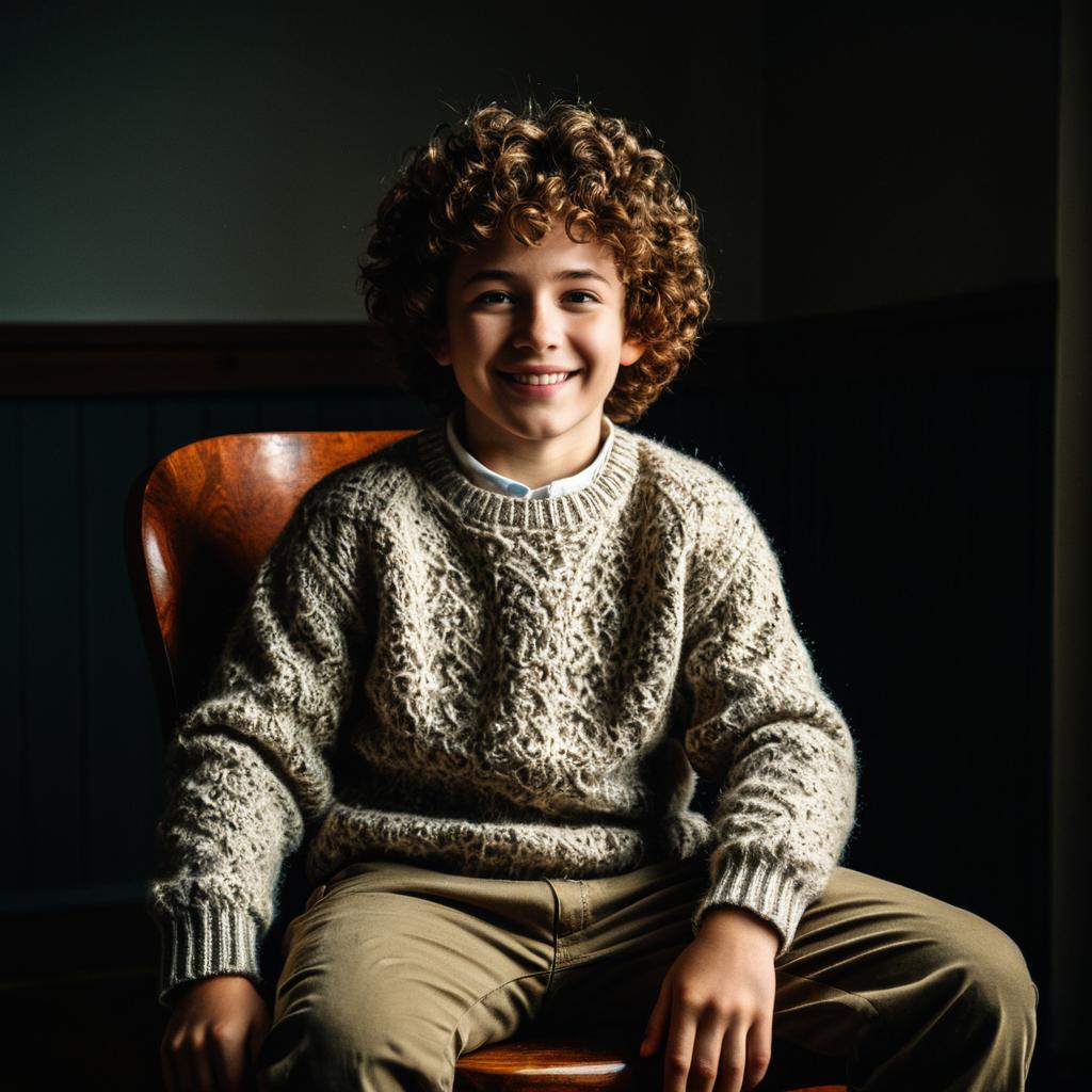 Portrait of a young boy with short chestnut curly hair and light freckles, wearing a textured light sweater and khaki pants. He is sitting on a wooden chair in a dimly lit room. The image features high dynamic range with vivid colors, rich details, and enhanced contrast that highlights his cheerful expression and perfect eyes.