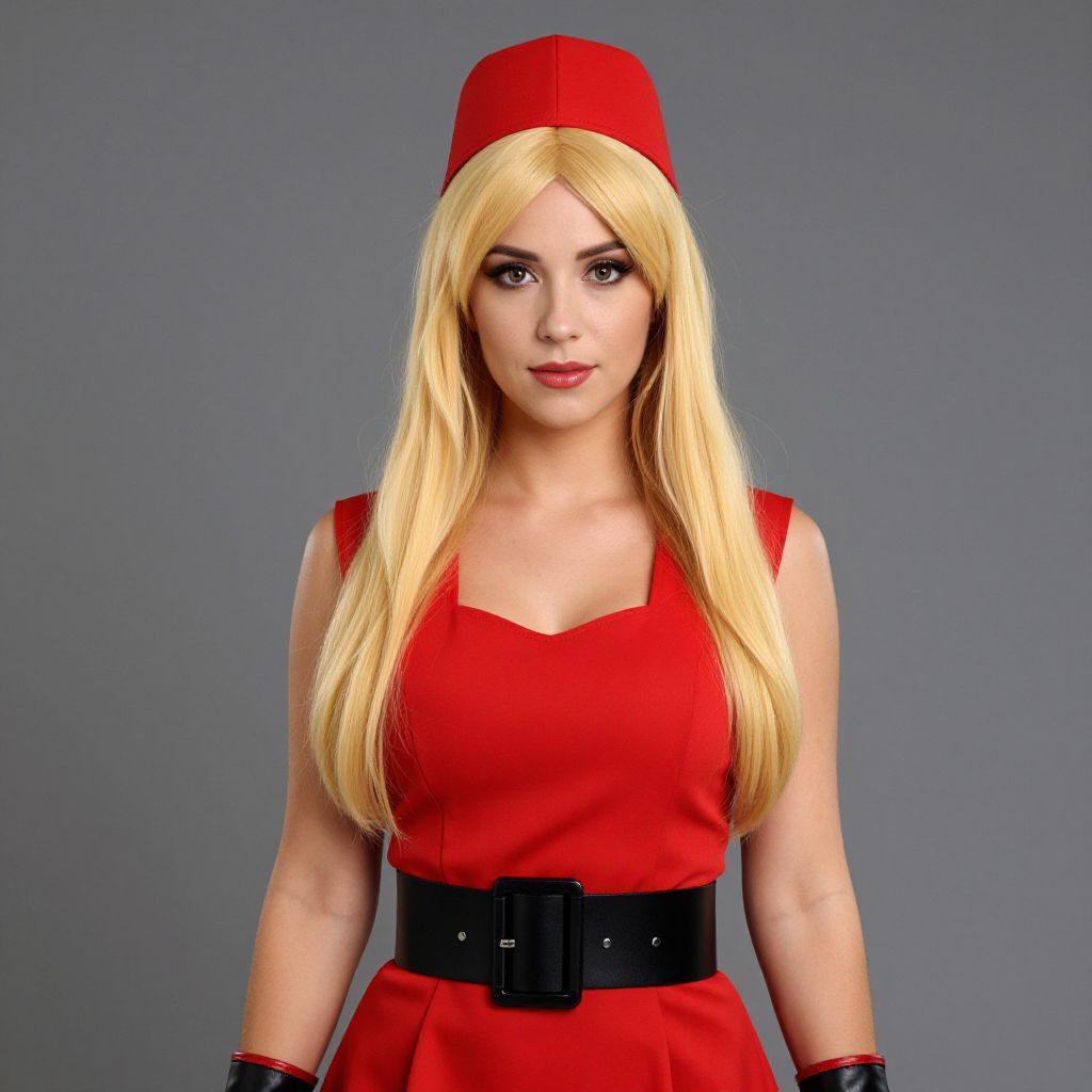 Photograph of a fair-skinned woman with long, straight blonde hair wearing a bright red, sleeveless dress with a square neckline and a black belt with a large buckle. She also has a red hat matching her dress and red wristbands. Her makeup includes dark eyeliner and red lipstick. The background is a simple, solid gray, putting focus on her vibrant outfit and confident expression.