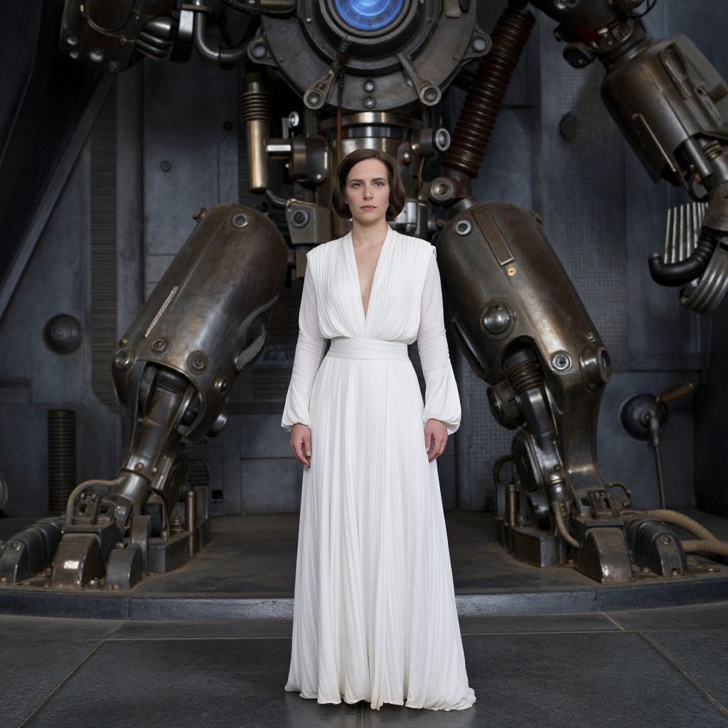 A woman in a white dress stands in front of a large, mechanical structure, resembling Princess Leia from Star Wars.