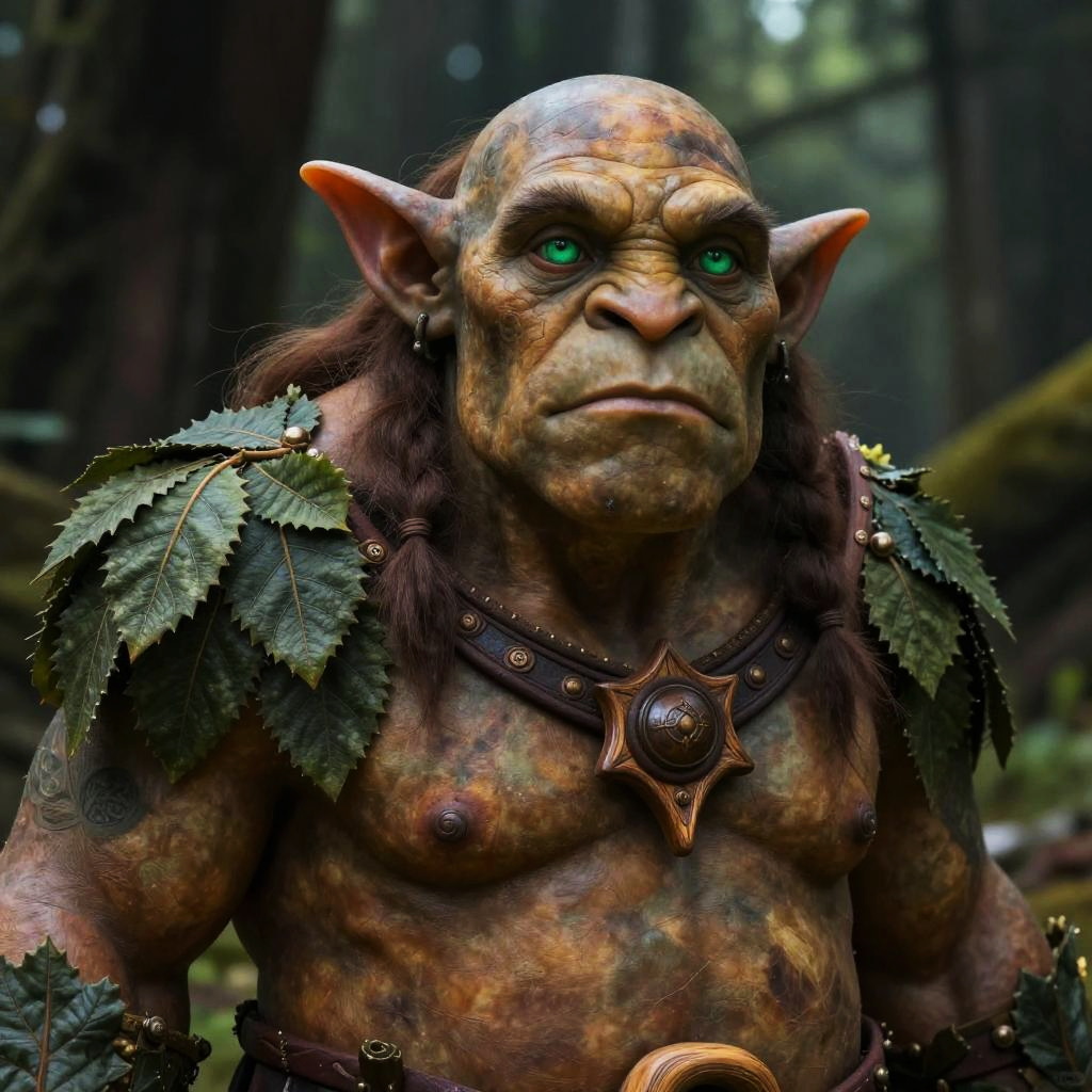 Photograph of a CGI-generated, fantasy-style, humanoid creature resembling an orc or troll in a dense forest. The creature has a wrinkled, aged face with a pronounced brow ridge, pointed ears, and long, wavy, brown hair adorned with small, colorful flowers and green leaves. It wears a fur-lined, dark brown leather vest with multiple metal and bone accessories, including a large, circular pendant. The background is blurred, featuring tall trees and dappled sunlight filtering through the forest canopy. The creature's expression is stern and contemplative, with a slightly furrowed brow and deep-set eyes.