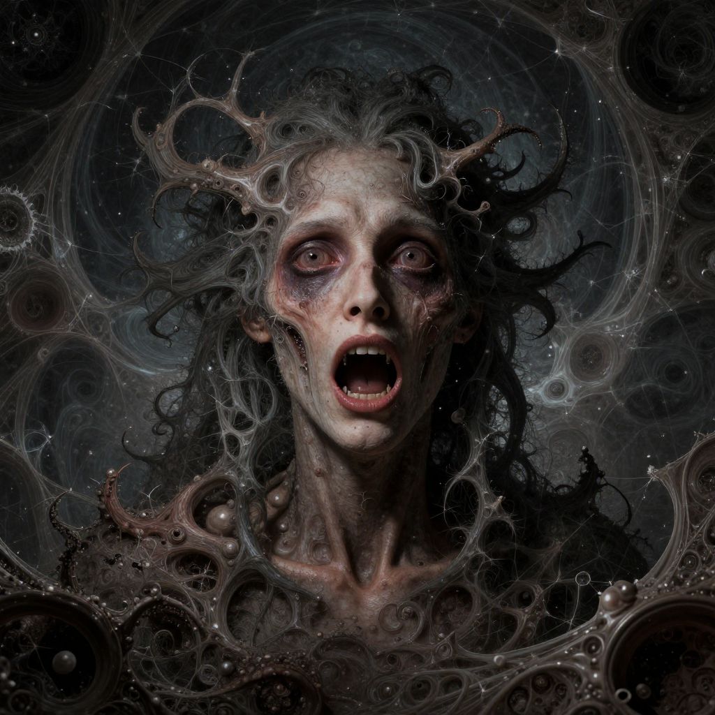 This is a digital art piece depicting a haunting, surreal portrait of a pale, gaunt woman with wild, dark hair and glowing, wide-eyed, red-rimmed eyes. Her mouth is open in a scream. She is surrounded by an intricate, swirling pattern of dark, organic tendrils and circular shapes that resemble a cosmic or alien environment. The background is a deep, dark blue-black with subtle star-like specks. Her skin is textured with fine details, and her expression is one of terror or agony. The overall style is dark fantasy, with a highly detailed and intricate composition.