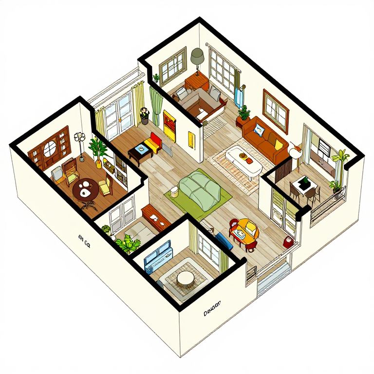 Floor layout template of a spacious family home, including multiple rooms with detailed furniture and decor, rendered in 3D isometric view, vibrant colors, clear labeled sections, emphasizing functional flow and accessibility