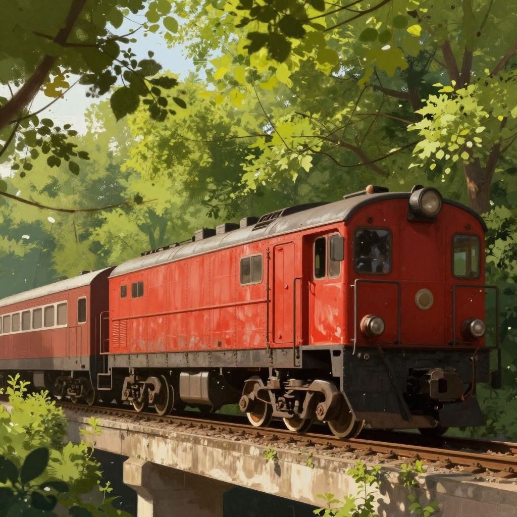 Red vintage freight train running under a concrete bridge, lush green leaves encroaching from above, evocative of IrinaKapi's style, iron wheels clanking, dense foliage, weathered texture on train and bridge, nostalgia-infused, warm sunlight filtering through leaves, digital painting, cinematic atmosphere.