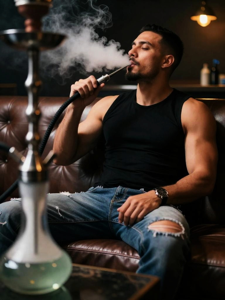 Man smoking shisha, adult man reclining on a leather sofa in a dim lounge, muscular man with crew cut and light stubble wearing fitted black sleeveless shirt and ripped jeans, holding the hookah hose close to his mouth as he exhales a thick cloud of smoke, large modern hookah with tinted glass base prominently blurred in the foreground, low depth of field, atmospheric shadows and soft warm highlights, cinematic lifestyle photograph, ultra realistic, high resolution