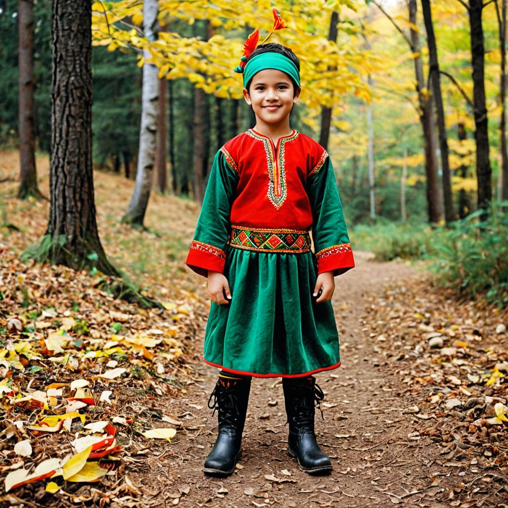 Portrait of a young Asian boy wearing a traditional cultural costume featuring a colorful headdress with vibrant orange feathers, intricate embroidery on a brown and red patterned tunic, multiple necklaces, and a grey scarf, set against a plain gray background.