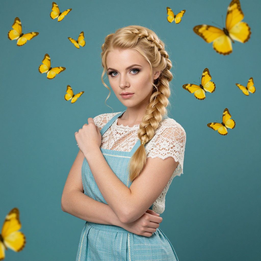 Golden-haired woman with intricate braids adorned in delicate lace and blue apron stands gracefully against a teal backdrop, surrounded by a fluttering swarm of vibrant yellow butterflies.