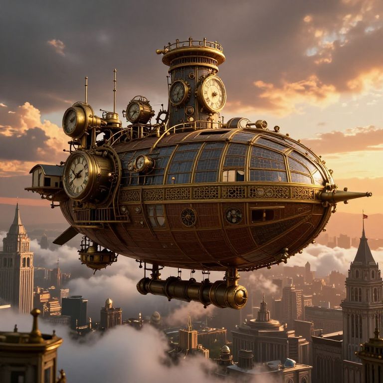Lod, a steampunk airship soaring above a sprawling city filled with clockwork machines and brass details, billowing clouds below and a dramatic sunset sky, intricate mechanical elements combined with Victorian-inspired architecture, richly detailed
